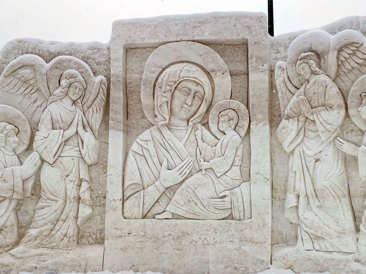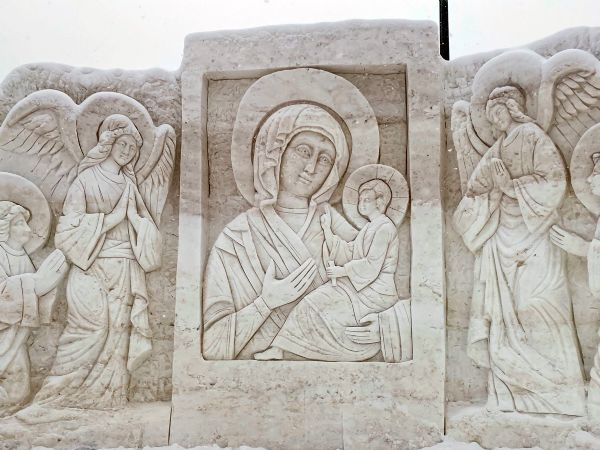 В Раифе вас ждёт величественный снежный вертеп, а также тончайшая работа по снегу, передающая лик Богородицы и библейские сюжеты.